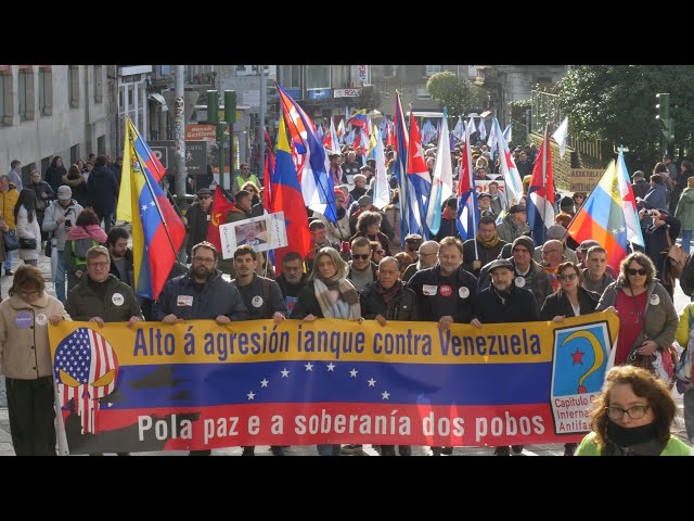 A marcha, convocada pola Asociación Galego-Bolivariana Hugo Chávez xunto a unha vintena de organizacións, percorreu as principais rúas da capital de Galiza este mediodía