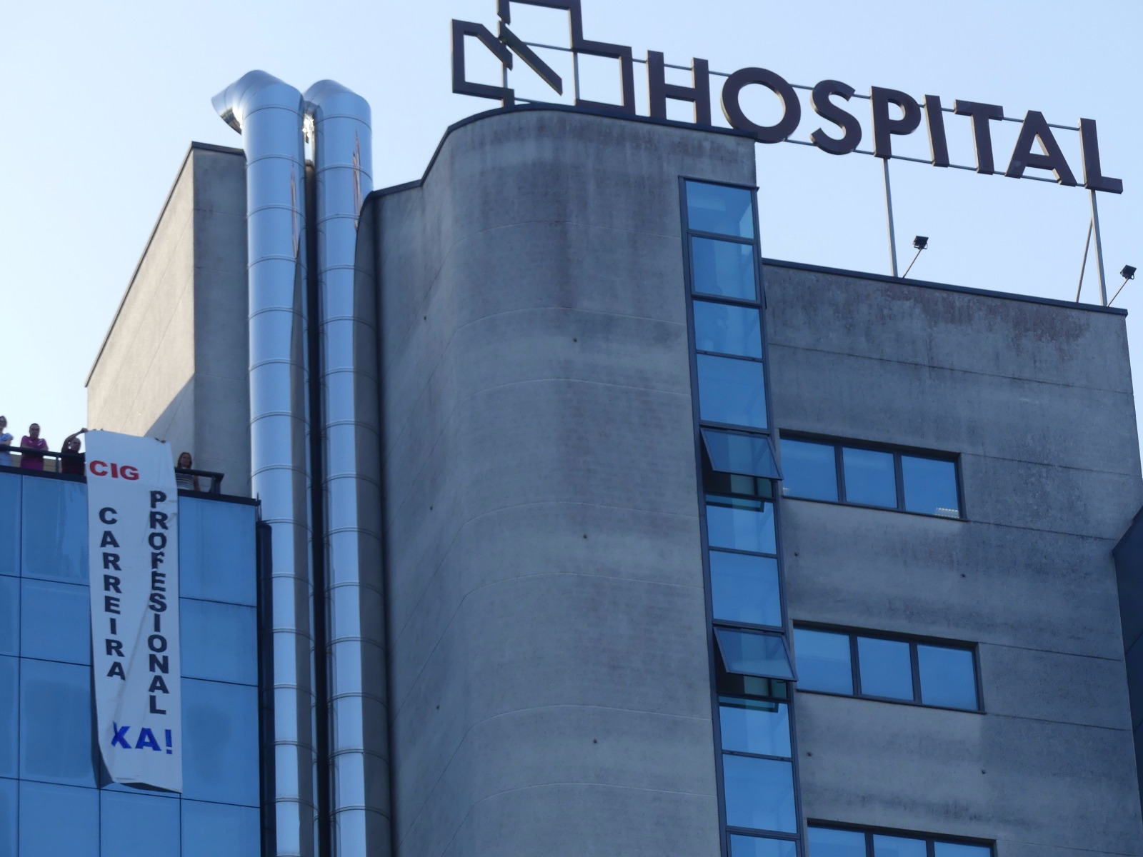 CIG-Saúde de Compostela descolga unha pancarta no Hospital Clínico en demanda da carreira profesional