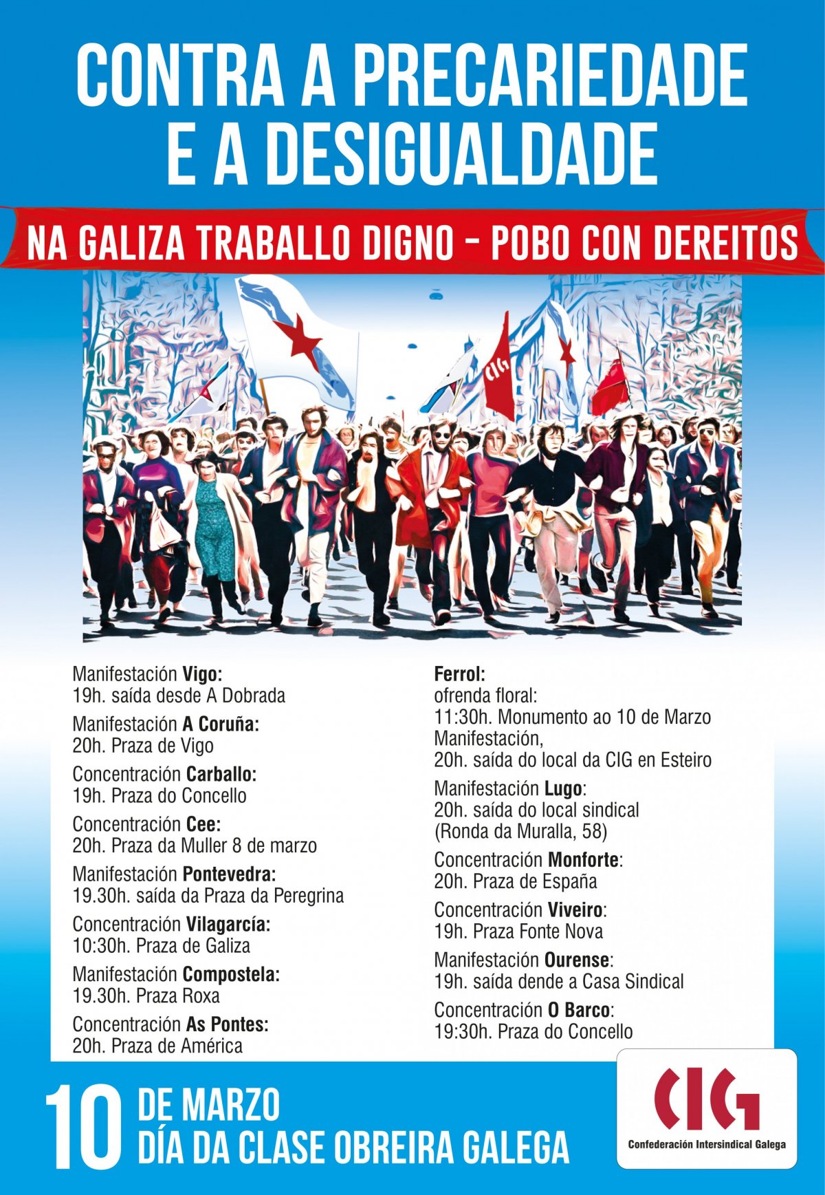 A CIG fai un chamado a converter este 10 de Marzo, Día da Clase Obreira Galega, nunha xornada de mobilización contra a precariedade e a desigualdade, para reivindicar traballo digno e sermos na Galiza un pobo con dereitos. Aínda que o sindicato nacionalista ten convocadas un total de 14 mobilizacións, os actos centrais do día terán lugar en Ferrol, coa tradicional ofrenda floral ao pé do monumento 10 de Marzo, ás 11:30 horas, e cunha manifestación que sairá ás 20:00 horas do local sindical e rematará no Cantón.