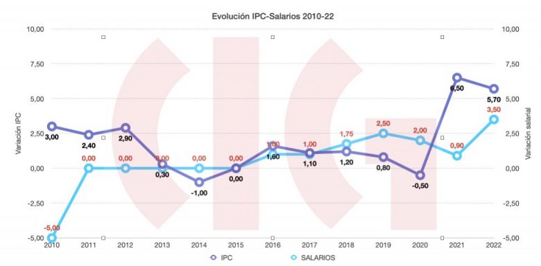 Unha suba retributiva adicional do 1,5% no ano 2022, o que implicou pasar do 2% imposto polo Goberno estatal a comezos do ano pasado ao 3,5% final, cando o ano pechou cun incremento do 5,7% do IPC. Ese foi o resultado do pacto salarial de UGT e CCOO co Ministerio de Facenda provocando, no ano de maiores incidencias da alza dos prezos, un novo recorte do poder adquisitivo para miles de traballadores e traballadoras do sector público. O resultado da evolución do desfase dos salarios ao respecto do carestía da vida elevouse no ano 2022 ao 18,64% desde o ano 2010 no que se produciron os primeiros recortes nas nosas nóminas.