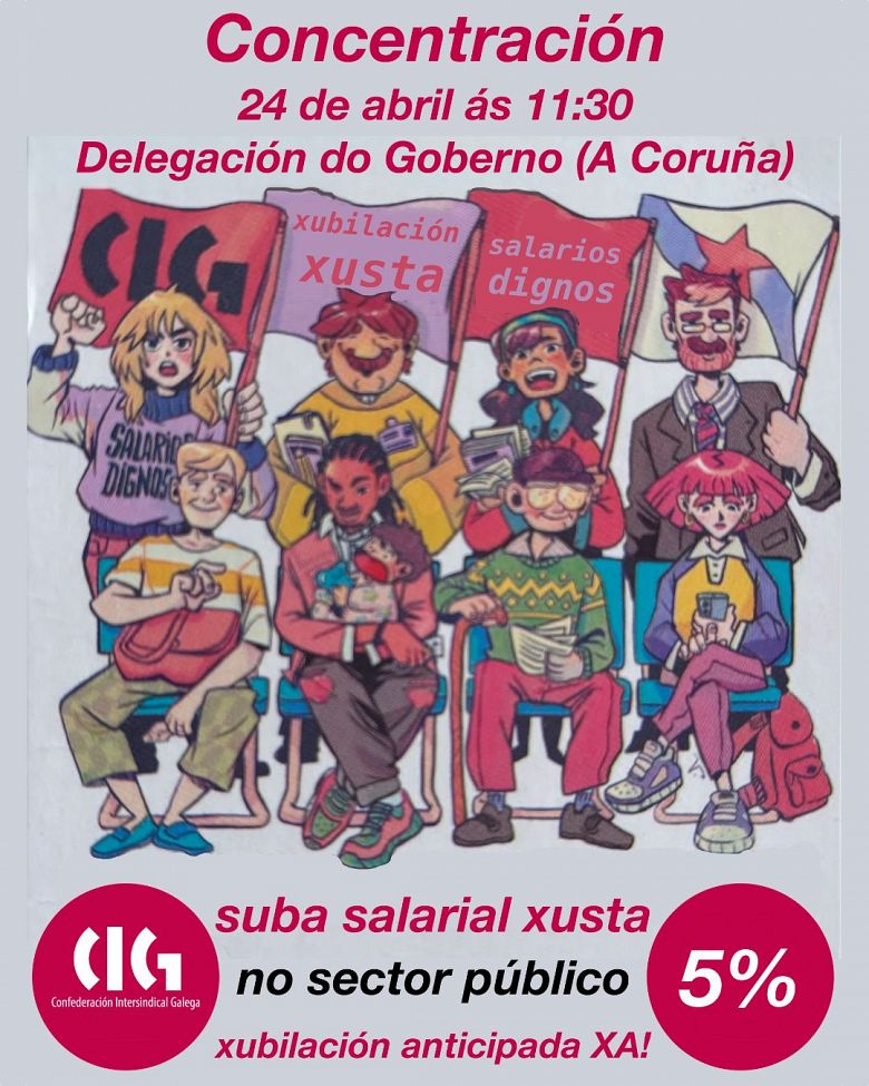 A Área Pública da CIG (CIG-Ensino, CIG-Administración e CIG-Saúde) mobilizarase o vindeiro xoves, día 24 de abril, ás 12:00 horas diante da Delegación do Goberno da Coruña para demandar unha suba retributiva que recupere a perda de poder adquisitivo que sufriron as persoas empregadas públicas e reclamar que se aborde na Mesa Xeral das Administracións Públicas a xubilación parcial que o Goberno pretende implantar sen negociacións coas organizacións sindicais.