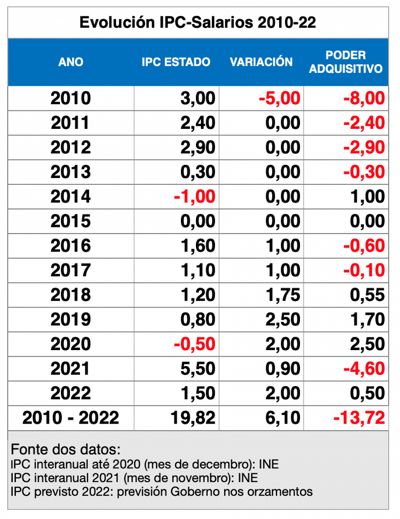 Sinala que o Goberno español impuxo un incremento do 2% dos salarios para o persoal das administracións en 2022, cando a taxa interanual do IPC acadou xa en novembro o 5,5%. "E incluso co IPC estimado do 1.5% para o próximo ano e a suba do 2% non chegaría para afrontar unha recuperación real do poder adquisitivo que perderon os salarios do persoal empregado público nos últimos 11 anos, que foi de máis dun 13%", incide.