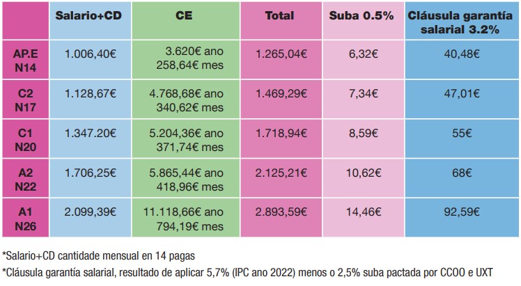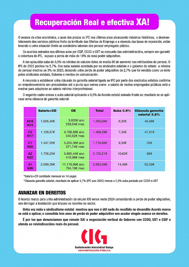 Denuncia que estes incrementos “foron vendidos como un éxito, cando realmente foron unha renuncia” ao nin sequera establecer unha cláusula de garantía salarial ligada ao IPC confirmándose así “un empobrecemento sen precedentes, até o punto de que vemos como o salario de moitas e moitos empregados públicos está a medrar para adaptarse ao Salario Mínimo Interprofesional”.