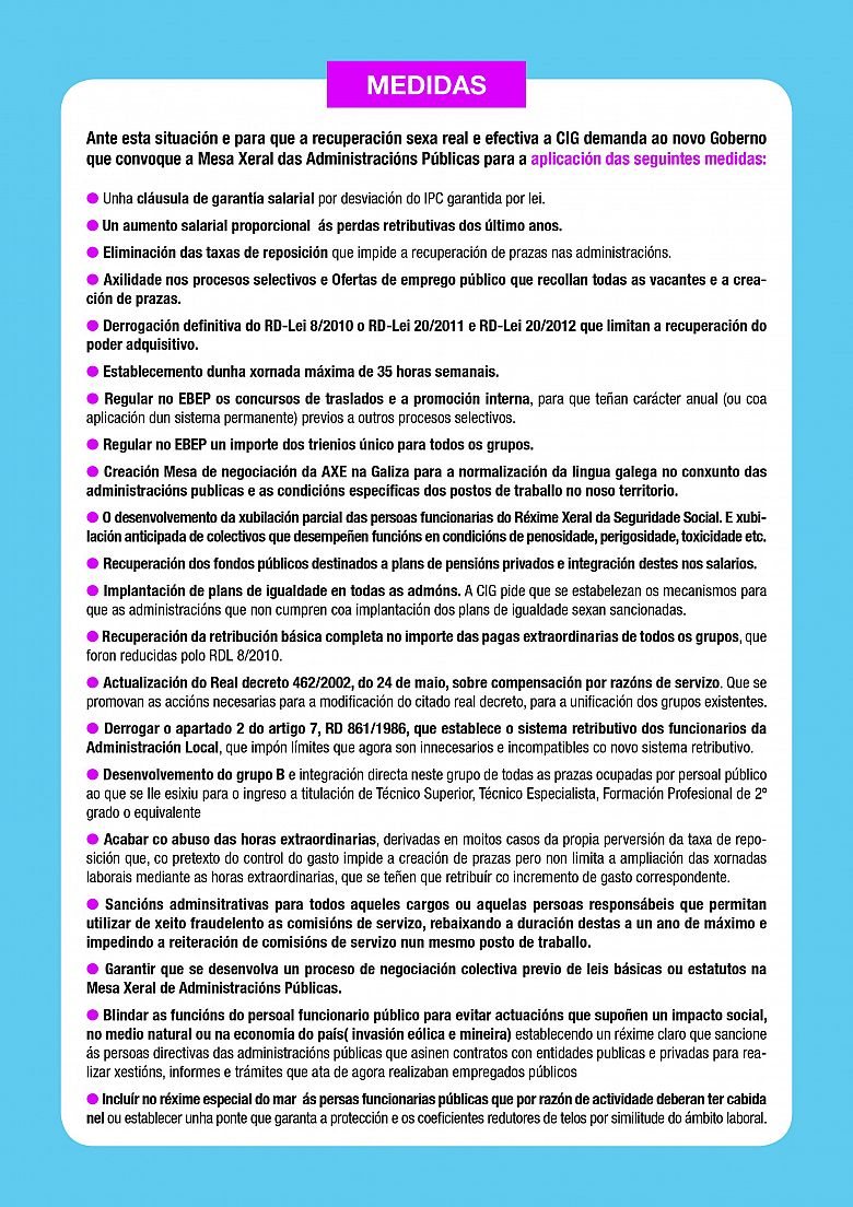 Outras das medidas contempladas pola CIG-Administración son a implantación de plans de igualdade en todas as administracións e que se estabelezan os mecanismos para que as administracións que non cumpren coa implantación dos plans de igualdade sexan sancionadas; a recuperación da retribución básica completa no importe das pagas extraordinarias de todos os grupos, que foron reducidas polo RDL 8/2010; a actualización do Real decreto 462/2002, do 24 de maio, sobre compensación por razóns de servizo e que se promovan as accións necesarias para a modificación do citado real decreto, para a unificación dos grupos existentes.