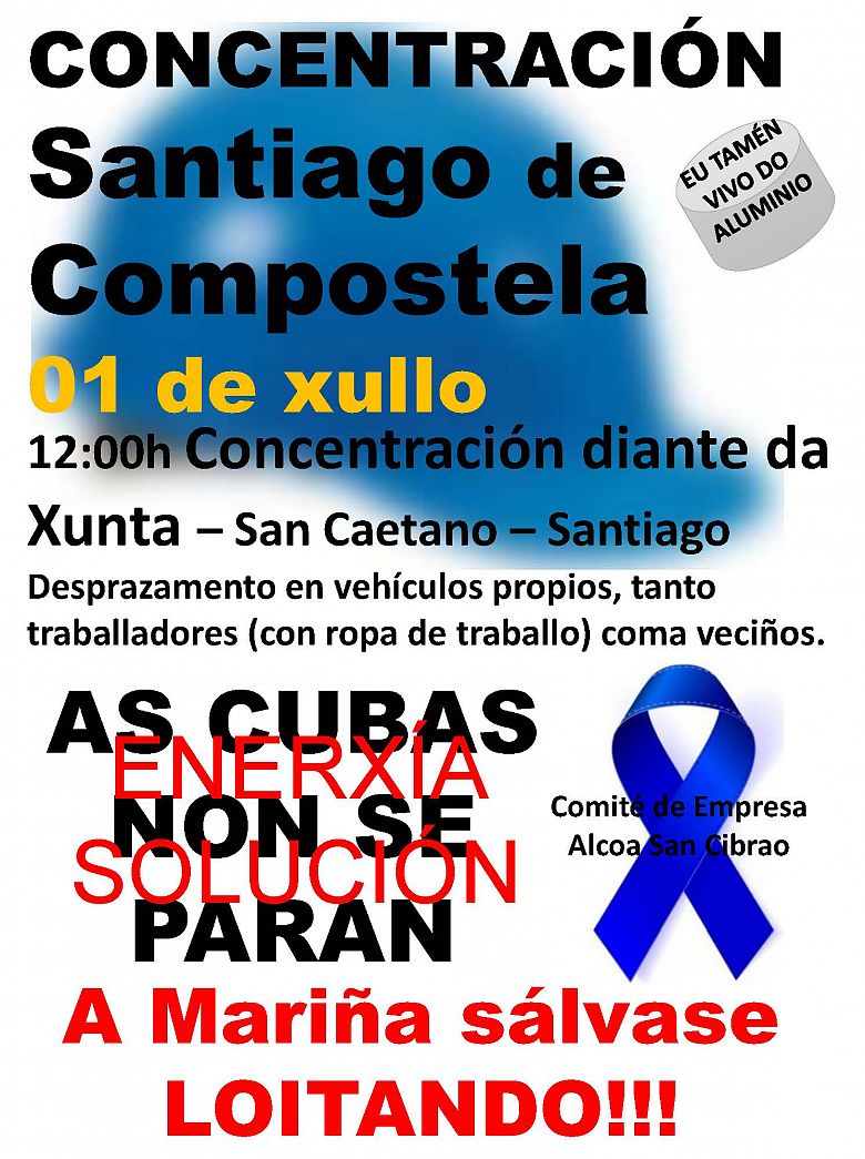 Polo tanto reiteramos una vez máis o noso apoio aos compañeiros e compañeiras de San Cibrao e animamos a todos os compañeiros/as de Alu Ibérica A Coruña a participar nas mobilizacións que se convoquen para salvar a industria do aluminio e electrointensiva en Galiza. Se actuamos toda a industria xuntos podemos ser máis eficaces e máis escoitados, porque se estamos reclamando día a día unha intervención, temos que saber que se non se produce unha intervención en Alcoa, menos posibilidades haberá de que se produza en Alu Ibérica.