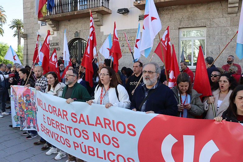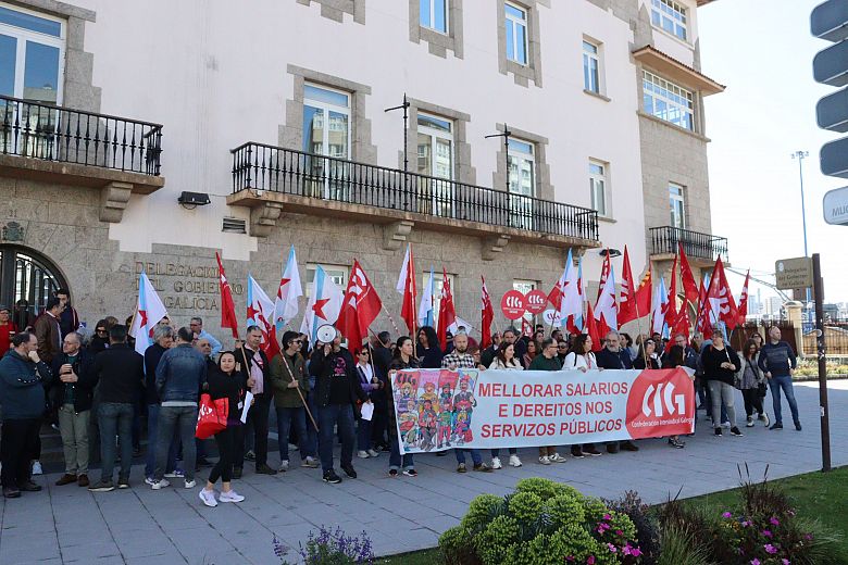 Representantes sindicais das tres federacións da Área Pública da CIG (Ensino, Administración e Saúde) concentráronse este xoves na Coruña diante da Delegación do Goberno para exixir a inmediata negociación dunha suba salarial que recupere o poder adquisitivo que se perdeu, como mínimo, desde o pacto sindical de CCOO e UGT de 2022, e no que se salvagarde que as retribucións nunca estarán por debaixo da evolución dos prezos.
