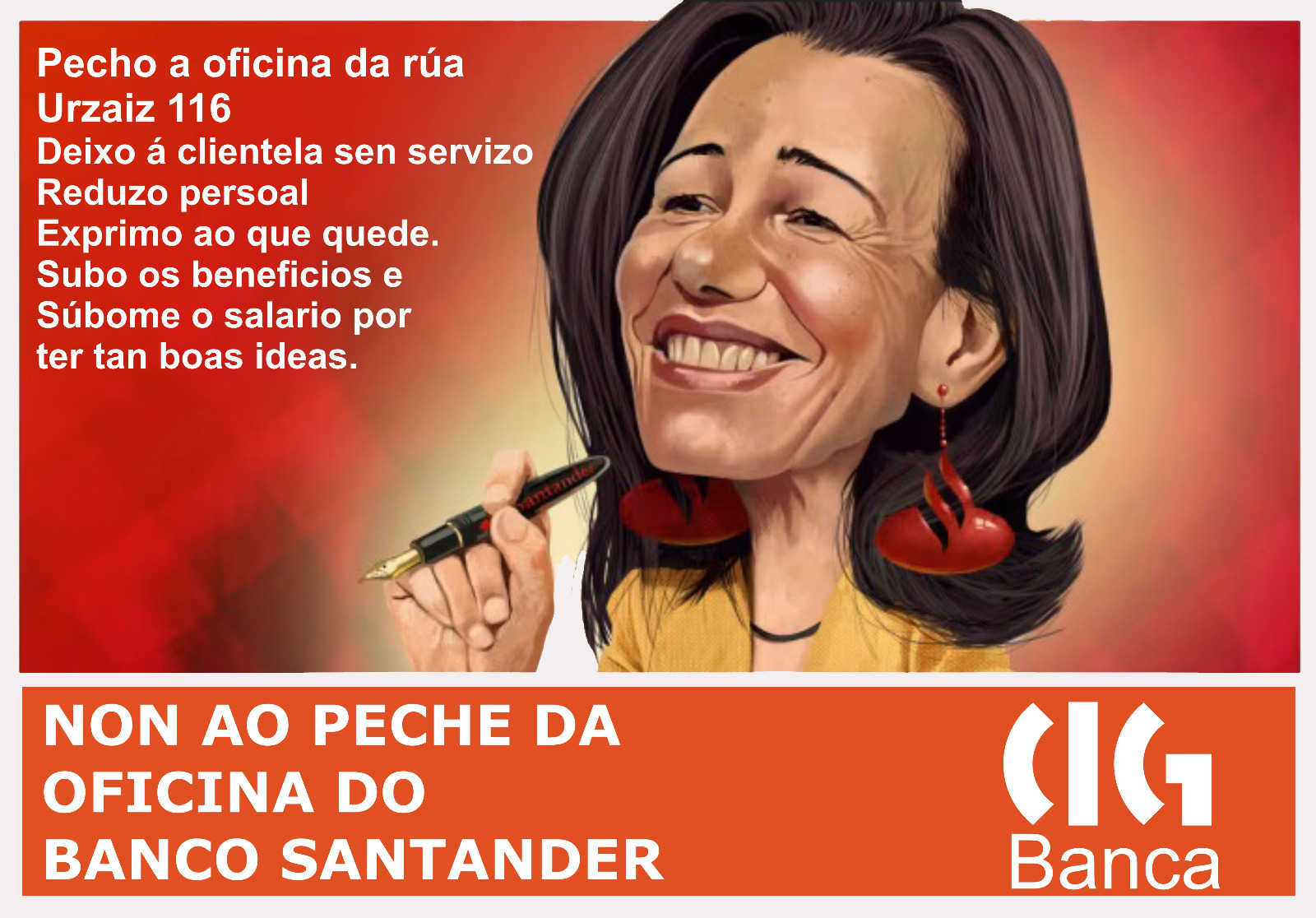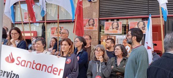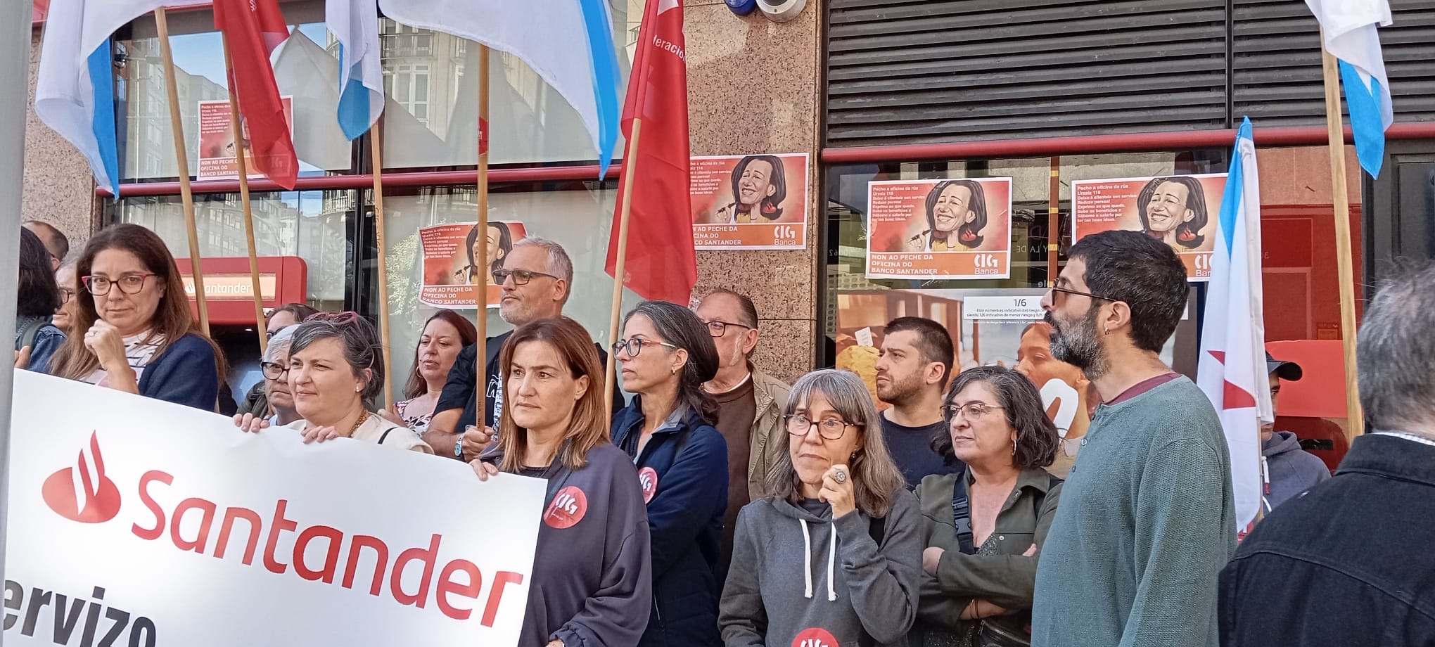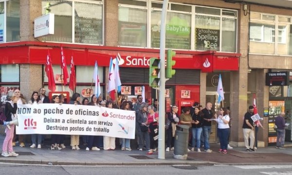 A CIG iniciou hoxe en Vigo un un calendario de mobilizacións para rexeitar o modelo de negocio que está a implantar o Banco Santander apoiándose na dixitalización forzosa da clientela e nunha nova tipoloxía de oficinas, que ten como consecuencia o peche de sucursais e a destrución de emprego. No que vai de ano a entidade xa clausurou 17 oficinas en Galiza e un total de 160 no conxunto do Estado e amortizou numerosos postos de traballo. As protestas continuarán en Lugo este venres 3 de outubro e na Coruña o vindeiro día 13.