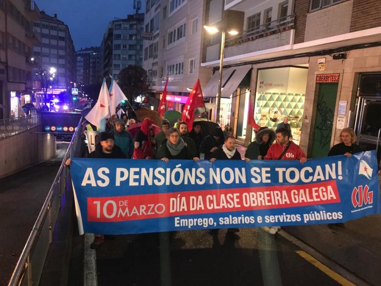 A CIG conmemorou este 10 de Marzo, Día da Clase Obreira, cunha xornada de mobilizacións nas sete cidades mais en Vilagarcía, Viveiro e A Estrada. Baixo o lema "As pensións non se tocan. Emprego, salarios e servizos públicos", a central nacionalista fixo un chamado a intensificar a mobilización ante a necesidade de continuar na resposta fronte a grave crise e a imparábel carestía da vida; e dende o firme convencemento de que as políticas favorábeis para a clase traballadora e para o pobo galego "hai que conquistalas, non son concesión bondadosa dos Gobernos nin nacen do diálogo social".