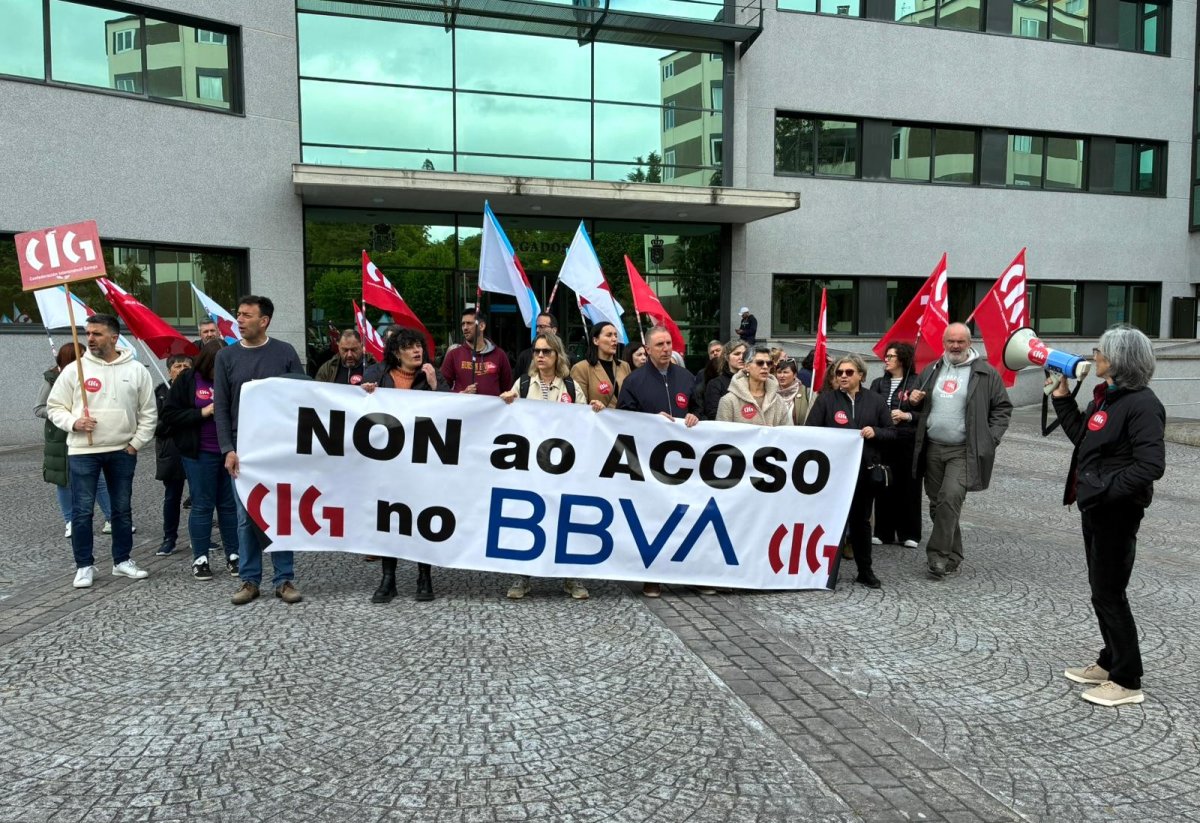 A sección sindical da CIG no BBVA concentrouse este xoves nos Xulgados de Lugo en apoio a unha compañeira, que ademais é delegada de persoal pola CIG, que sufriu acoso laboral por parte do seu superior directo. A protesta realizouse coincidindo coa celebración do xuízo pola demanda presentada contra o BBVA por vulneración de dereitos fundamentais, xa que a entidade bancaria dilatou de maneira inxustificada a apertura do protocolo de acoso, incorreu en varias irregularidades durante a súa aplicación e permitiu que se vulnerara a garantía de indemnidade da delegada.