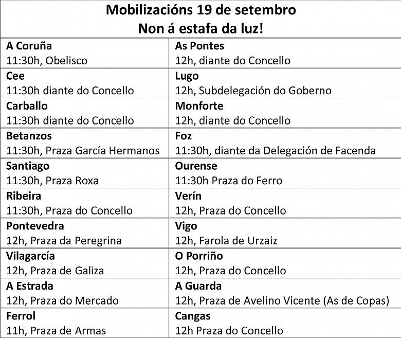 A CIG ten convocadas para o vindeiro domingo, día 19 de setembro, un total de 20 concentracións en cidades e vilas de toda Galiza baixo o lema “NON Á ESTAFA DA LUZ, Recuperación das Centrais Hidroeléctricas, Tarifa Eléctrica Galega”. A central sindical fai un chamamento a participar nestas mobilizacións diante do imparábel medre da factura da luz e a impunidade coa que actúan as eléctricas pero, sobre todo, tal e como denunciou o secretario xeral, Paulo Carril, diante do “nulo papel que tanto o goberno galego como o español están a facer para garantir, con políticas públicas, o acceso á electricidade do conxunto do pobo en condicións asequíbeis”.