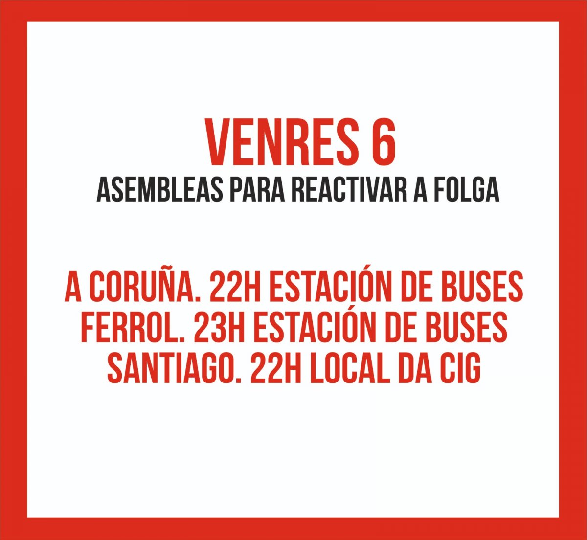A CIG convoca asembleas abertas de persoal para a noite deste venres -ás 22 horas na estación da Coruña, ás 22 horas no local da CIG en Santiago de Compostela, e ás 23 horas na estación de Ferrol-, para decidir o calendario de reactivación da folga e para explicar a complexa situación á que a patronal e as centrais asinantes do preacordo teñen abocado o sector.