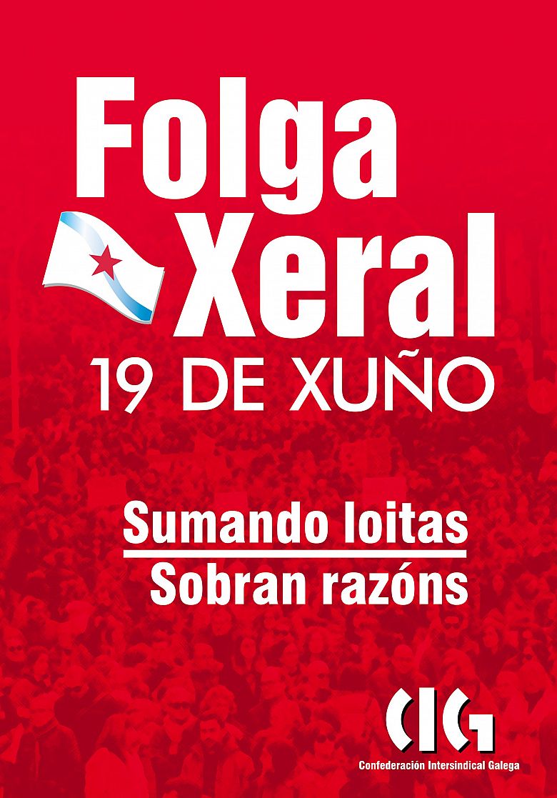 Chegou o tempo de sumar todas estas loitas e esforzos para dar a resposta necesaria. Na CIG apostamos por non resignarnos, por actuar, por contestar como sempre fixo a clase traballadora e convocar unha folga xeral para o 19 de xuño que sirva para dar unha petada na mesa e berrar ben alto: xa basta de recortes!