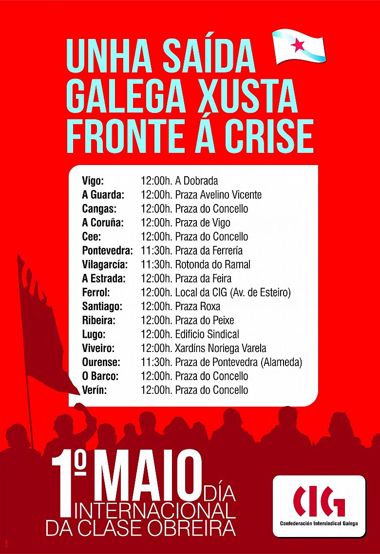 A CIG conmemora este ano o Primeiro de Maio, Día Internacional da Clase Traballadora, cun total de 16 manifestacións e concentracións –a central en Vigo-, en todas as cidades e en múltiples vilas da xeografía de galega baixo o lema “Por unha saída galega xusta da crise”. Un lema que, segundo explicou o secretario xeral, Paulo Carril, resume as principais demandas da central sindical para enfrontar a crise económica que viñamos padecendo, agudizada agora pola pandemia.