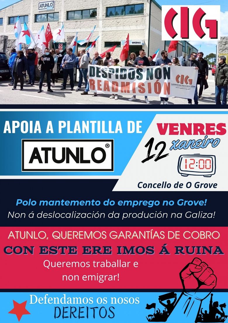 A FGAMT-CIG do Salnés convoca unha concentración este venres 12 de xaneiro diante do Concello do Grove ás 12:00 horas para que se garanta o cobro das indemnizacións por parte do persoal de Atunlo afectado polo ERE extintivo que vai aplicar a empresa, que se atopa en preconcurso de acredores.