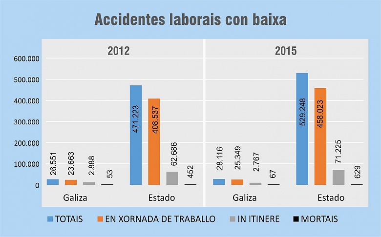 As últimas estatísticas sobre accidentes no lugar de traballo indican que aumentaron un 12,3% en 2015 –con 529.000 accidentes, incluídas 629 mortes- en relación con 2012. Os datos dispoñíbeis para os primeiros seis meses de 2016 confirman esta preocupante tendencia á alza. Un incremento que a CIG atribúe á precariedade laboral consecuencia das reformas legais do Goberno que incrementaron os contratos de tempo fixo e de tempo parcial e que derivaron nun deterioro da saúde e das condicións de traballo.