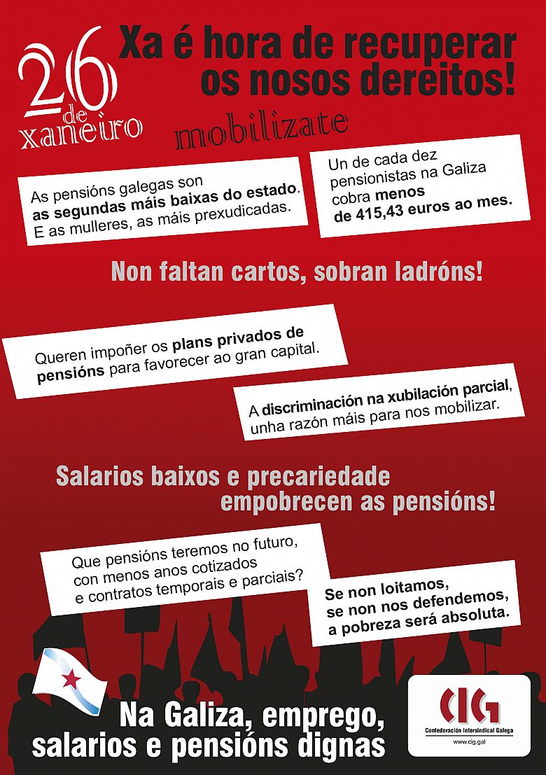 Así o denuncia a secretaria de Organización da CIG, Susana Méndez, quen considera que esta é unha razón máis para mobilizarse o vindeiro 26 de xaneiro en Compostela, na manifestación nacional que a CIG ten convocada desde o pasado mes de decembro, en defensa “dunhas pensións públicas dignas e garantidas, que teñan a súa base nun mercado laboral forte, con emprego de calidade e estábel, e con salarios dignos". Méndez afirma que “a sustentabilidade do sistema de pensións non é un problema económico, senón político”.