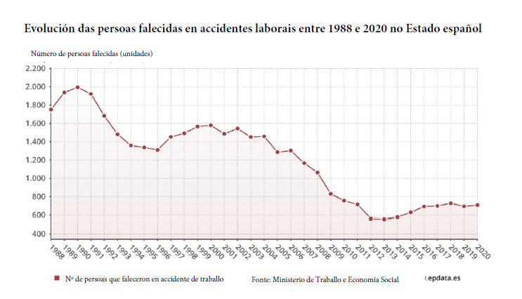 Non houbo grandes avances nesta materia, e aínda que o número total de accidentes baixou, incrementáronse os sucesos de carácter grave ou mortal. De tal maneira que en 2020 (malia a caída brutal da actividade) rexistráronse 788 accidentes mortais, o que supón 13 máis que en 2019. Resultan de relevancia tamén os accidentes in itinere que, no Estado español, teñen unha concepción máis restrinxida que noutros estados.