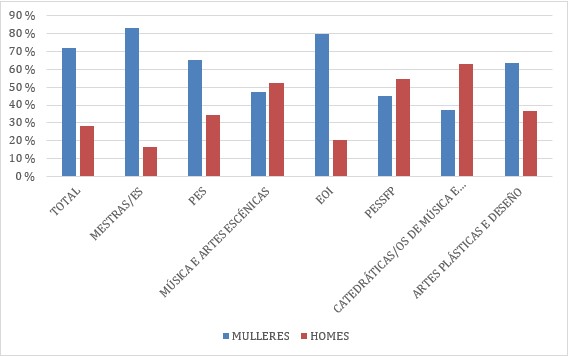 En canto á distribución por corpos e especialidades, pódese constatar que hai moitas diferenzas se pasamos a comparar o dato total co dos diferentes corpos e especialidades dentro deles. Recollemos algúns exemplos nos seguintes gráficos: