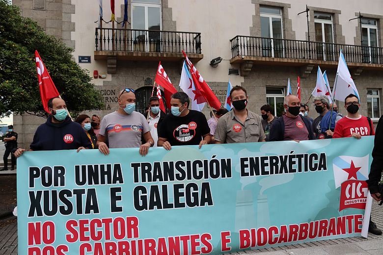 A CIG realizou unha concentración este venres diante da Delegación do Goberno na Coruña para esixir unha transición enerxética galega xusta no sector dos carburantes e biocarburantes e que garanta, no marco do proceso de descarbonización da economía, a posta en marcha de alternativas de reindustrialización e creación de postos de traballo nos territorios afectados.
