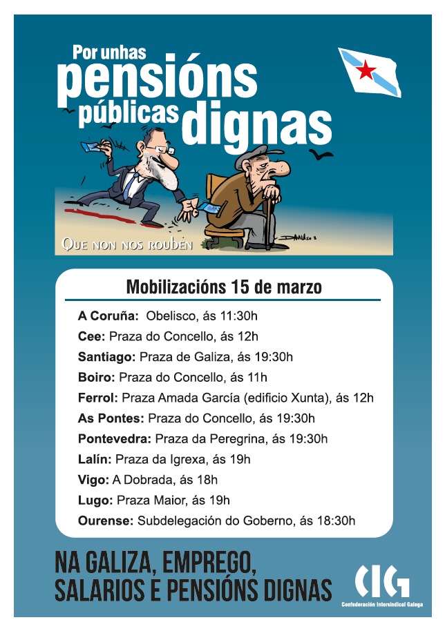 A CIG decidiu intensificar a campaña que está a desenvolver en defensa das pensións ante o grave perigo que corre o sistema público como consecuencia da ofensiva do Goberno español do PP e da gran banca para promover os plans de pensións privados. O colectivo de Xubilados/as e Pensionistas convoca unha ducia de mobilizacións nas sete cidades e en varias vilas do país este xoves día 15 de marzo.