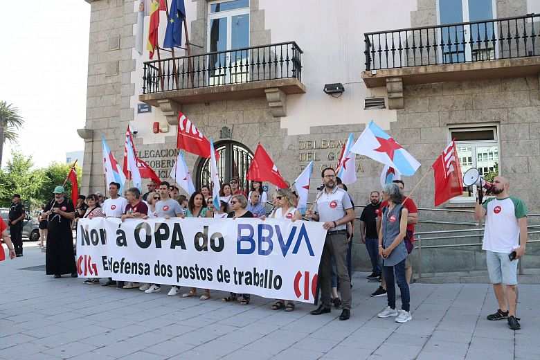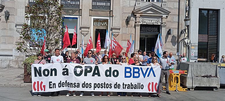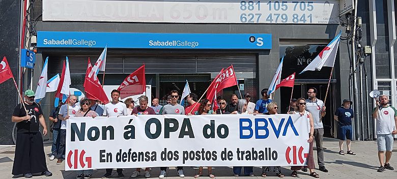 Alén da perda de emprego, a OPA, subliñaron Miguel Fernández e Miguel Lis, responsábeis da CIG no BBVA e Sabadell respectivamente, aumentaría as dificultades da clientela no acceso a servizos bancarios, con redución da competencia e máis atrancos ao creto.