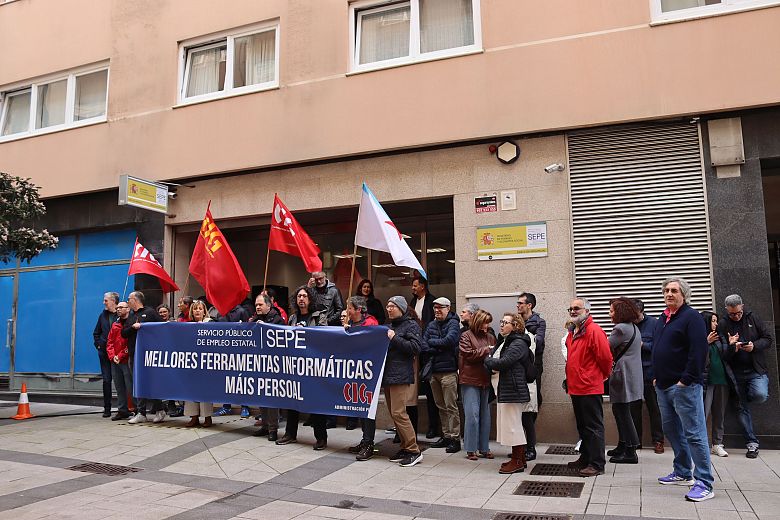 A CIG-Administración Pública concentrouse este xoves diante da dirección provincial do SEPE na Coruña en resposta á situación de colapso na que se atopa o organismo pola alarmante falta de persoal e a posta en marcha dunha nova aplicación ineficaz para tramitar as prestacións. Con esta protesta, que se repetirá nos próximos días no resto de direccións provinciais, a central tamén demanda a dimisión do director xeral do Servizo de Emprego Público Estatal pola súa inacción na busca de solucións.