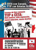 Un obxectivo moi afastado das bondades que se nos pretenden vender: creación de postos de traballo, dinamismo comercial e un incremento das exportacións. Mais, fronte a esta visión positiva, o CETA (considerado o paso previo a imposición do TTIP e o seu “cabalo de troia”-de aí a simboloxía que se podía ver na manifestación de Bruxelas-) favorece a desregulación en materia laboral, fomenta a privatización do público, introduce unha flexibilidade no eido da seguridade, a saúde pública e ambiental descoñecida para os estándares europeos, compromete seriamente a soberanía e limita as xa minguadas capacidades dos parlamentos dos diferentes estados da unión. É dicir, estes tratados constitúen na realidade unha agresión aos nosos dereitos máis elementais.