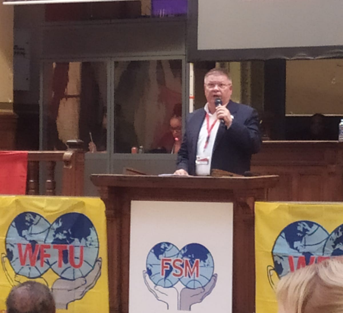 Alén do discurso de benvida da CGT de Francia, como organizadora dos actos, escoitouse a intervención de Mzwandile Makwayiba, sindicalista sudafricano e presidente da FSM; e tamén do seu secretario xeral, o chipriota Pambis Kyritsis. Houbo tamén ocasión de escoitar os saúdos do Comité de Mulleres Traballadoras e do Comité da Xuventude Traballadora da FSM.