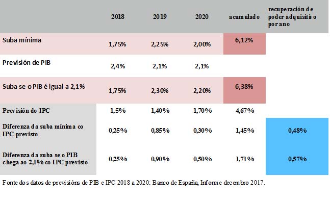 Ademais, segundo eses mesmos informes do Banco de España, o IPC destes tres anos (2018 a 2020) experimentará un incremento do 4,67%. “Isto implica que parte da recuperación do noso poder adquisitivo se limitará a un 0,48% anual, ou 0,57%, no mellor dos casos)”.