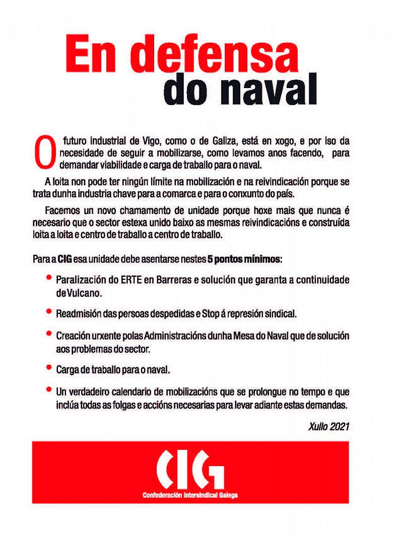 A CIG vén de solicitarlle ao Goberno español e á Xunta de Galiza que, de maneira urxente, ambas administracións poñan en marcha a Mesa do Naval para a Ría de Vigo (con presenza das organizacións sindicais e patronais máis representativas) para abordar as solucións reais que aseguren a continuidade da actividade e o emprego neste sector, estratéxico para a comarca e para Galiza.