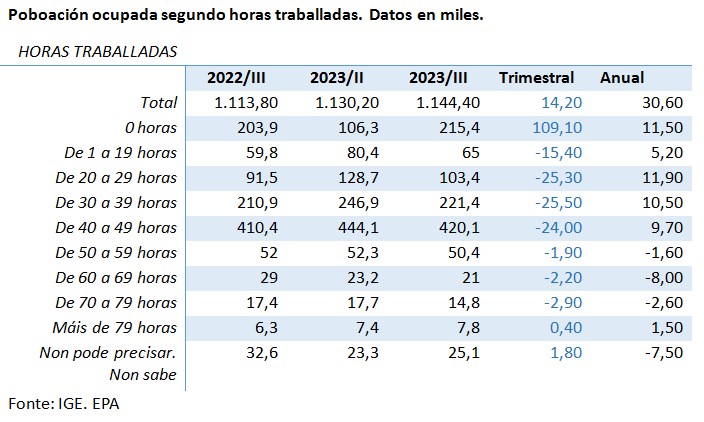 Xunto a isto, segundo os datos da EPA, e con respecto ao terceiro trimestre do pasado ano, aumentou o número de persoas que traballan entre 40 e 49 horas en 10.000 e as que traballan máis de 79 aumentaron en 1.500. Para González Sío, o que está sucedendo é que, “moi á contra do que se di, traballamos máis, e iso sen contar as persoas que teñen contratos a tempo parcial e están traballando horas en negro, que non cotizan, ou as horas extra que se pagan en 'B', e tampouco cotizan. Se se fixera realmente unha mostra das horas que se traballa é evidente que estaría moi por riba das 40 horas e mostraría o grao de precariedade tamén na xornada”.
