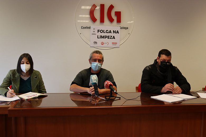 Os representantes da CIG, Paulo Rubido, UGT, Juan Carreira e CCOO, Alejandra Gesto, integrantes do comité de folga do sector da limpeza de edificios e locais da provincia da Coruña, compareceron esta mañá en rolda de prensa para denunciar a actitude da patronal; anunciar a presentación dun recurso contra os servizos mínimos abusivos decretados pola administración e advertir que, de non se garantir o dereito constitucional á folga das traballadoras e traballadores, converterán o conflito nun problema de orde pública.