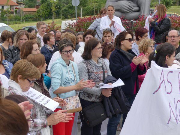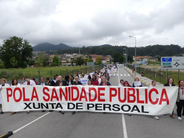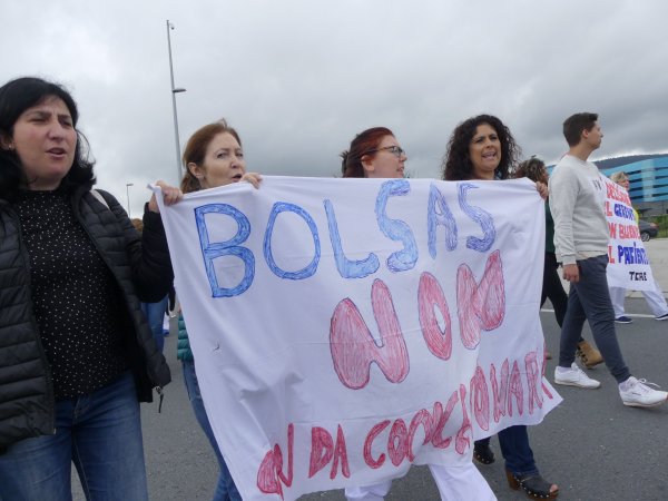 Traballadores/as pertencentes a todos os colectivos profesionais do hospital Álvaro Cunqueiro de Vigo participaron este martes na mobilización convocada pola comisión de centro en apoio da loita das Técnicos/as en Coidados Auxiliares/as de Enfermaría (TCAE) para rexeitar a decisión da Xerencia da EOXI de obrigalas/os a asumir o traslado das bolsas da roupa sucia, función que até o de agora realizaba a concesionaria. O colectivo de TCAE ten convocadas catro xornadas de folga para os vindeiros días 18, 21, 25 e 28 de xuño. [GALERÍA DE IMAXES NO INTERIOR]