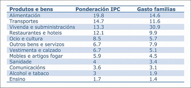 Estas ponderacións contrastan coas publicadas polo propio INE na “Enquisa de Orzamentos Familiares” do ano 2016, tamén elaborada cunha nova fórmula impulsada pola UE: alimentación o 14,6%; vivenda e subministracións o 30.9%; transportes 11.6%; restaurante e hoteis 9.9%; ocio e cultura 5.7%; outros bens e servizos 7.9%; vestimenta e calzado 5.1%; mobles e artigos do fogar 4.5%; sanidade 3.4%; comunicacións 3.1%; alcohol e tabaco 1.9%; ensino 1.4%.
