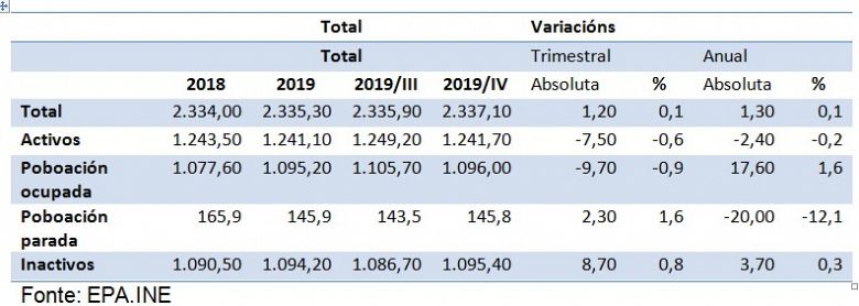 Os datos da EPA constatan, de feito, que a perda de poboación activa é unha constante independentemente de que se cree ou destrúa emprego. De feito, neste último ano, perdéronse un total de 2.400 persoas activas. Unha cifra que no último trimestre acadou as 7.500 persoas.