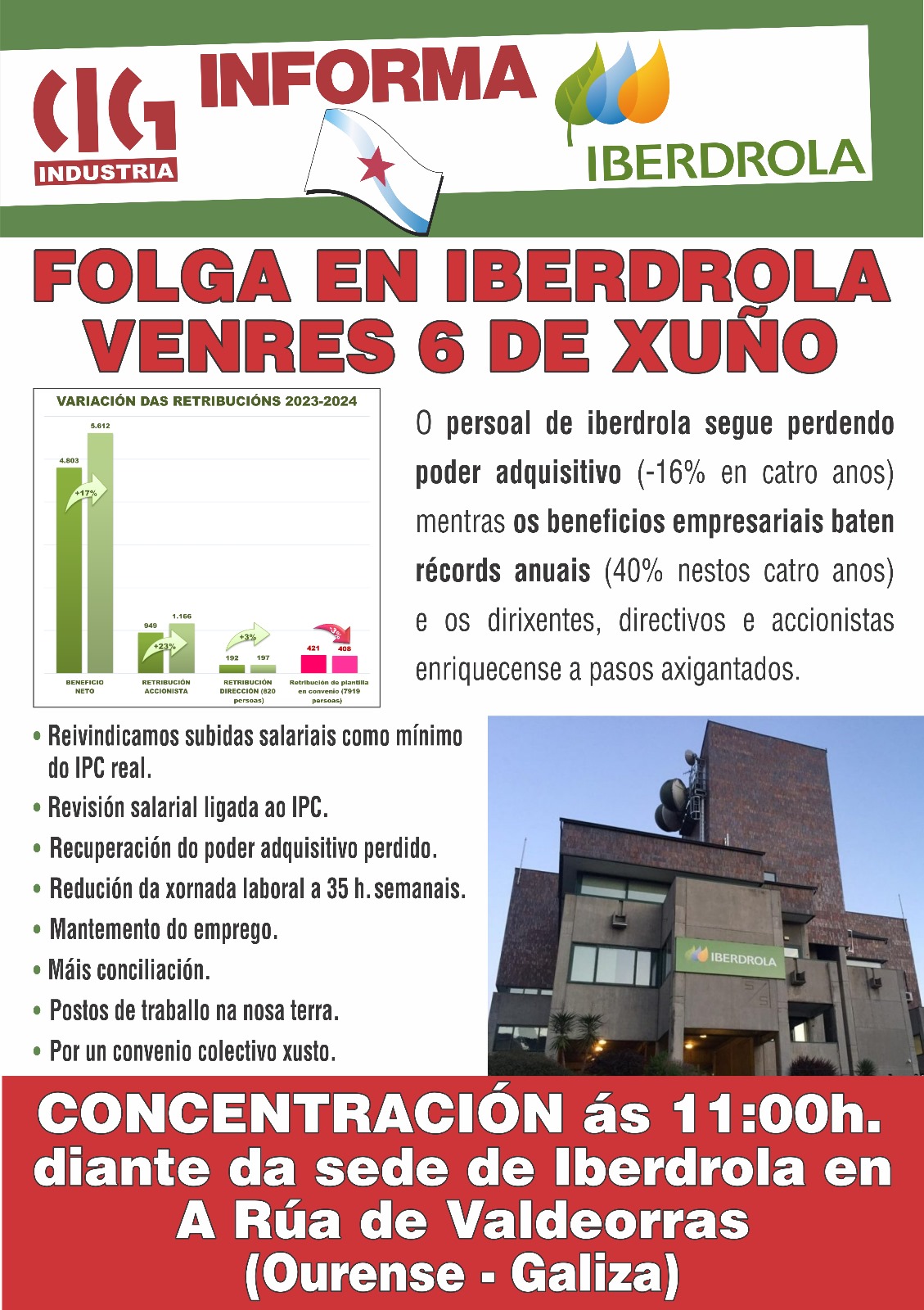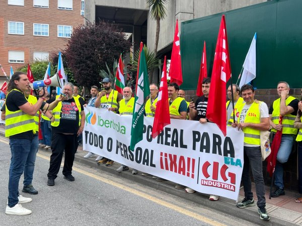 O práctica totalidade do persoal operario galego de Iberdrola secundou hoxe a folga convocada por ELA, CCOO e UGT en demanda dun convenio colectivo digno, xornada que a CIG-Industria aproveitou para desenvolver unha concentración diante da sede da compañía na Rúa de Valdeorras para reclamar a recuperación do poder adquisitivo, vinculando a revisión salarial ao IPC, e polo mantemento do emprego no noso país.