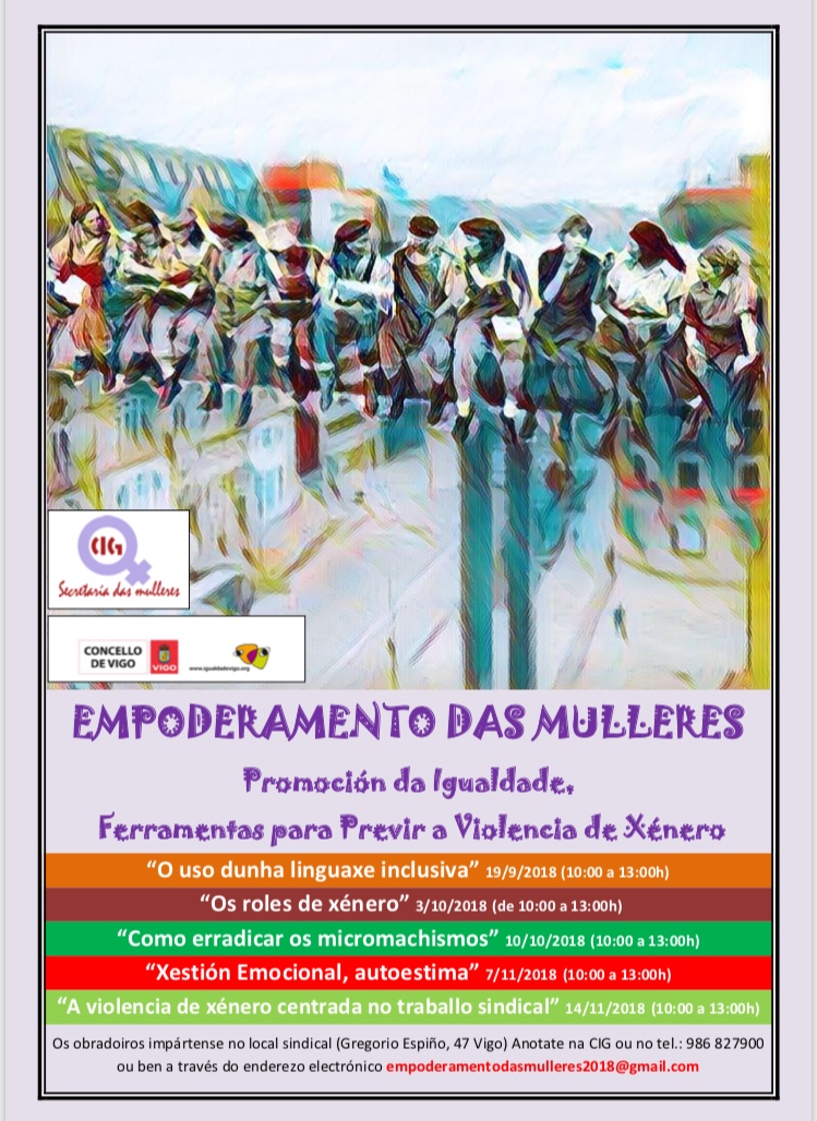 A edición de 2018 da formación en igualdade que organiza a secretaría da muller da CIG de Vigo constará de cinco obradoiros agrupados sobre o título “Empoderamento das mulleres. Promoción da Igualdade. Ferramentas para previr a violencia de xénero” e require de inscrición previa. Desde o departamento convidan a participar nas mesmas, incidindo na formación como mecanismo fundamental de cara a erradicar as desigualdades e eliminar os estereotipos e as violencias machistas.