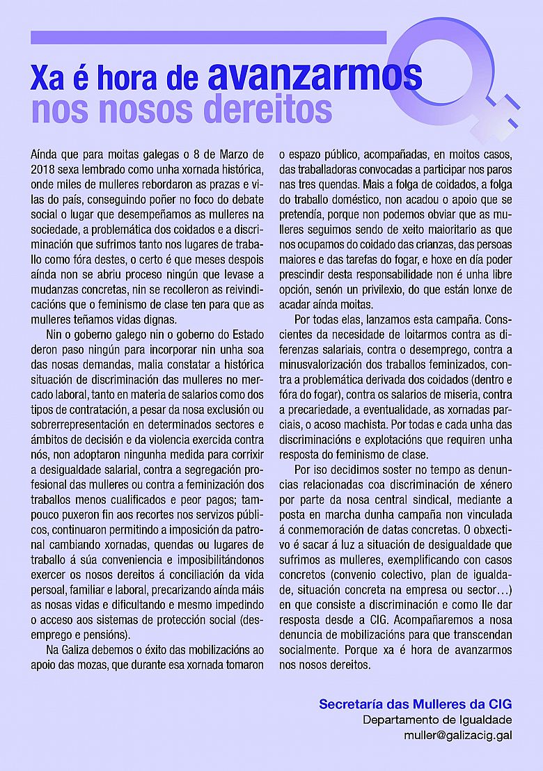 A Secretaria das Mulleres da CIG, Margarida Corral, presentou esta mañá, en rolda de prensa, unha campaña que se desenvolverá ao longo dos vindeiros meses baixo o lema “Xa é hora de avanzar nos nosos dereitos”, coa que se pretende visibilizar, denunciar, sensibilizar e combater as discriminacións que sofren as mulleres, polo feito de o seren, no mundo do traballo. Tal e como explicou Corral “lanzamos esta campaña conscientes da necesidade de loitarmos contra as diferenzas salariais, contra o desemprego, contra a minusvalorización dos traballos feminizados, contra a problemática derivada dos coidados (dentro e fóra do fogar), contra os salarios de miseria, contra a precariedade, a eventualidade, as xornadas parciais, o acoso machista. Por todas e cada unha das discriminacións e explotacións que requiren unha resposta do feminismo de clase”.
