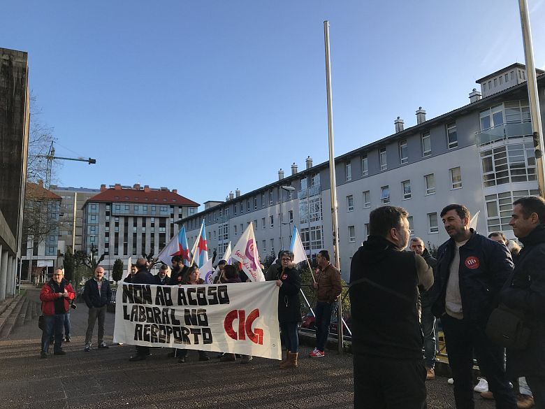 Compañeiros e compañeiras e representantes da CIG-Servizos de Compostela concentrábanse esta mañá diante dos xulgados de Fontiñas coincidindo coa primeira das vistas do xuízo contra o coordinador de seguridade do aeroporto de Santiago, polo acoso continuado que padeceron varias traballadoras e que padeceu tamén o delegado da CIG, Xosé Luís Castro, tras denunciar a actitude machista e o trato denigrante ao que estaban sometidas.
