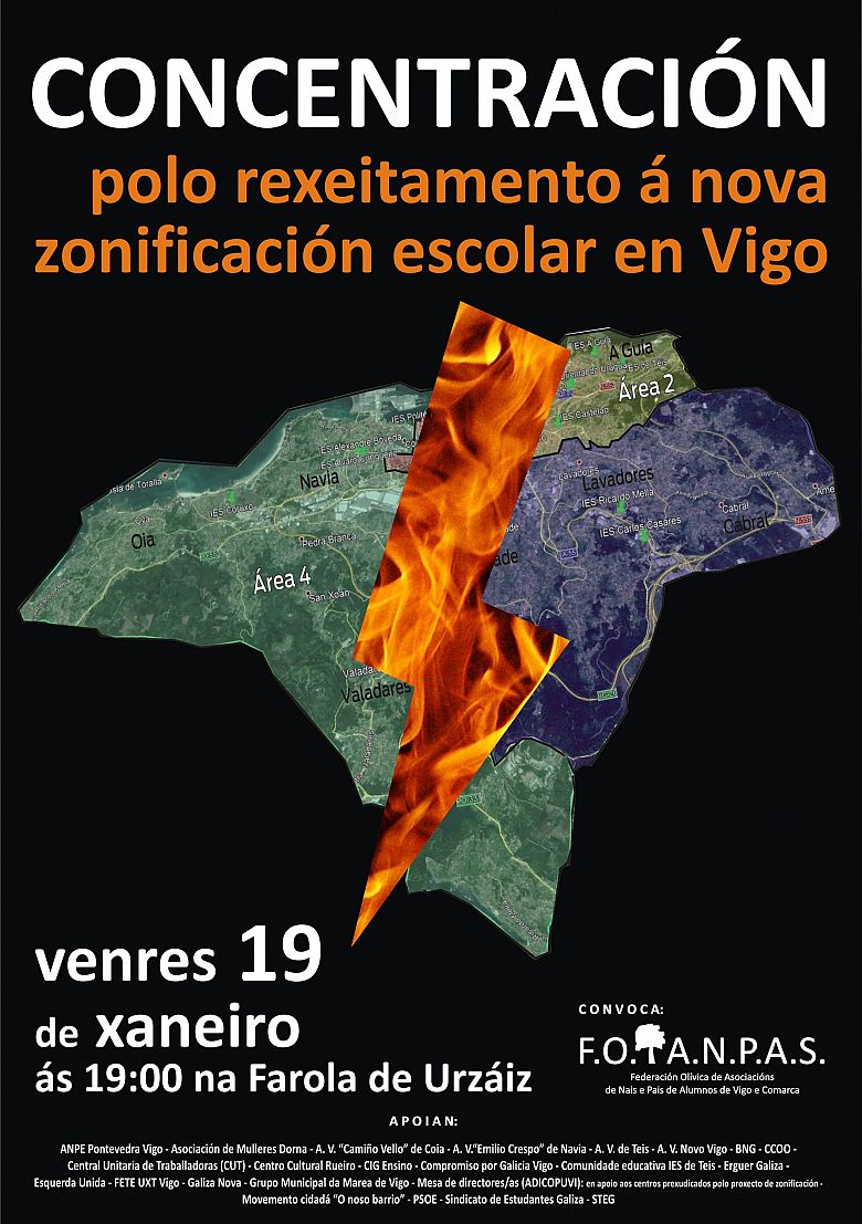 Por outra banda, arredor dunha vintena de colectivos sindicais, educativos, políticos e veciñais de Vigo volverán mobilizarse este venres 19 para amosar o seu rexeitamento ao proxecto de nova zonificación escolar da cidade. A protesta, convocada pola Federación Olívica de Asociacións de Nais e Pais (Foanpas), terá lugar na farola de Urzaiz ás 19:00 horas.