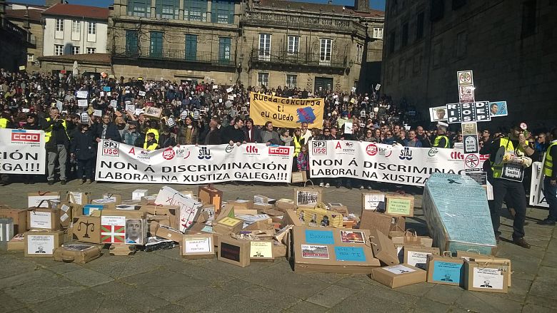 Miles de funcionarias e funcionarios de Xustiza tomaron as rúas compostelás, portando maletas, e ao berro de “Eu non me vou”. Respondían así ao convite que lles fixo en mesa de negociación o Director Xeral de Función Pública, Xosé María Barreiro, quen os/as convidou a pedir o traslado a outra comunidade autónoma se estaban descontentos/as co salario que tiñan en Galiza.