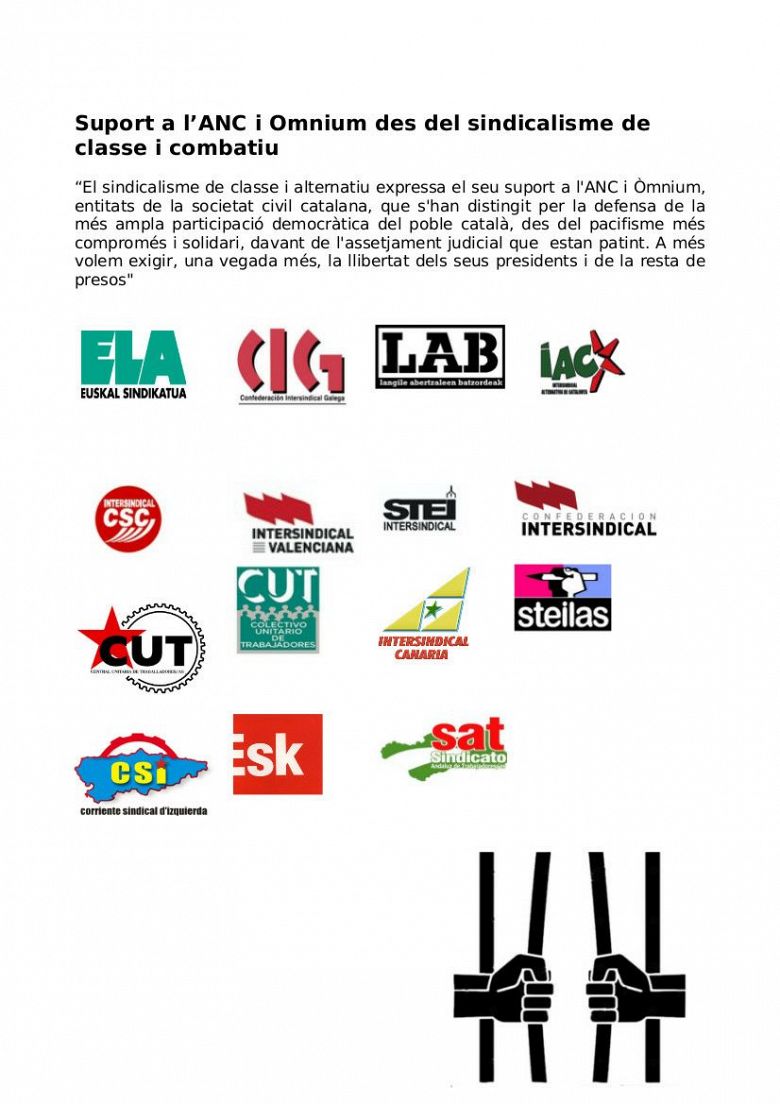 As organizacións sindicais ELA, CIG, LAB, IAC, Intersindical CSC, Intersindical Valenciana, STEI Intersindical, Confederación Intersindical, CUT Galiza, CUT, Intersindical Canaria, Steilas, CSI, ESK e SAT veñen de manifestar o seu apoio á Asemblea Nacional Catalá e Omnium.