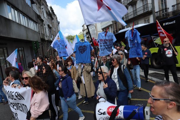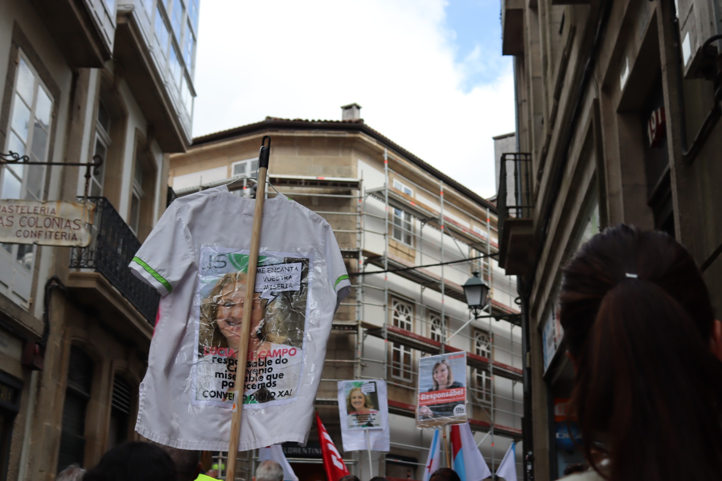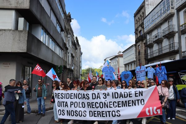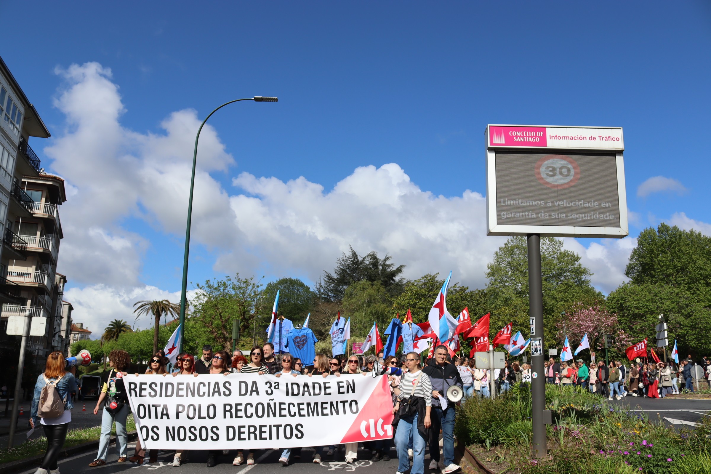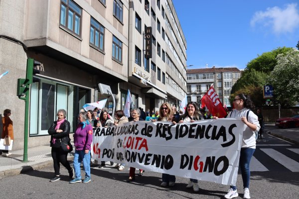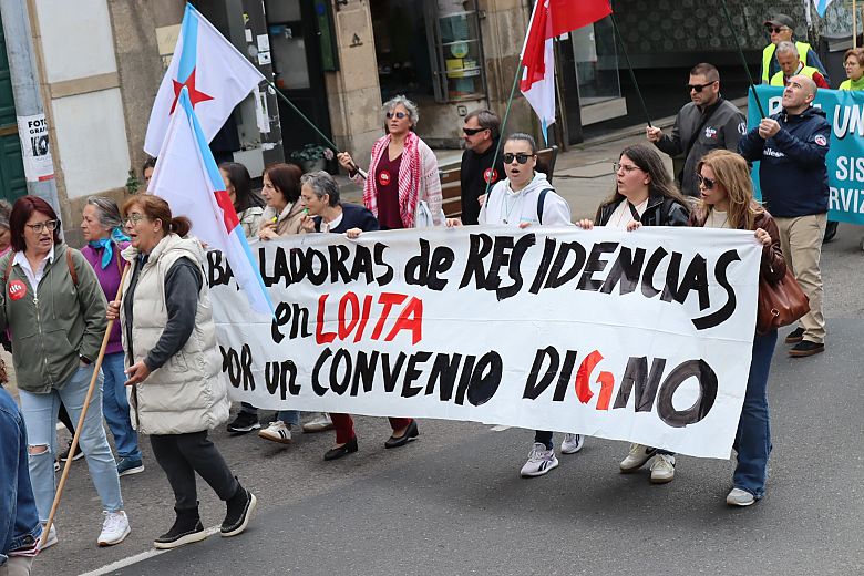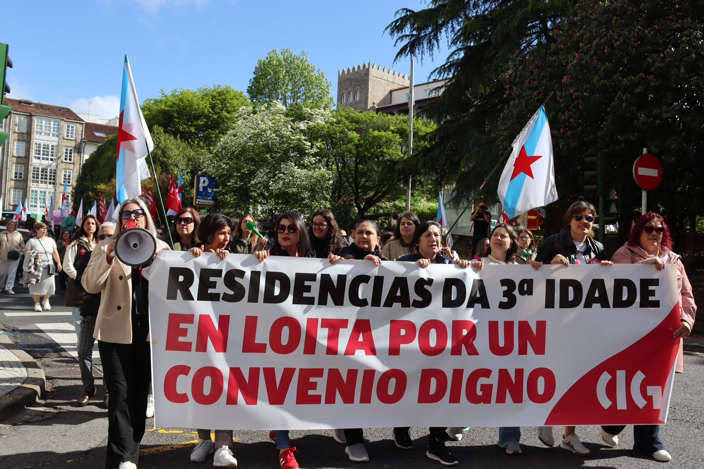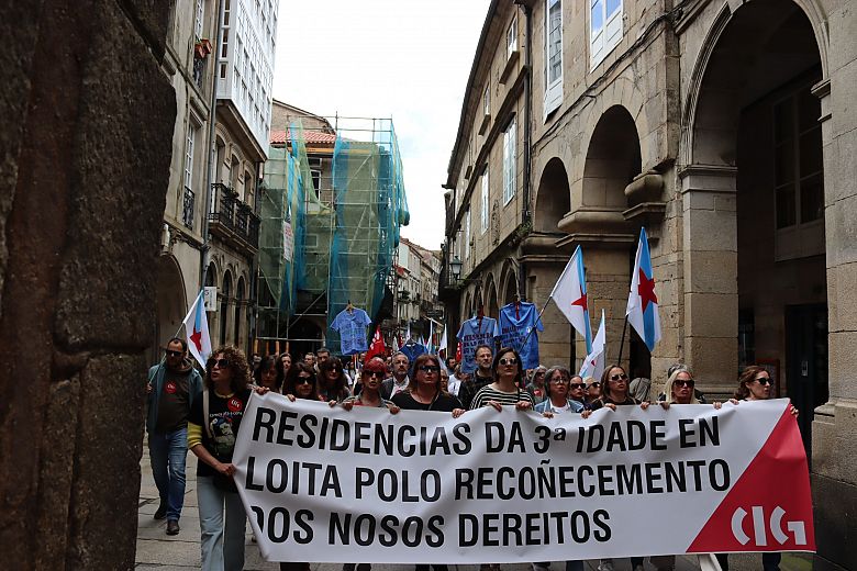 Traballadoras de residencias privadas de maiores e do Servizo de Axuda no Fogar (SAF) percorreron esta mañá as rúas de Compostela nunha manifestación convocada pola CIG-Servizos para esixir un convenio colectivo que dignifique as súas condicións laborais e garanta unha atención de calidade ás persoas dependentes. A protesta, que partiu ás 11:00 horas desde a Alameda e rematou na Praza de Praterías, congregou a traballadoras de toda Galiza, que denunciaron a precariedade laboral, os baixos salarios e a falta de compromiso tanto da patronal como da Xunta de Galicia.