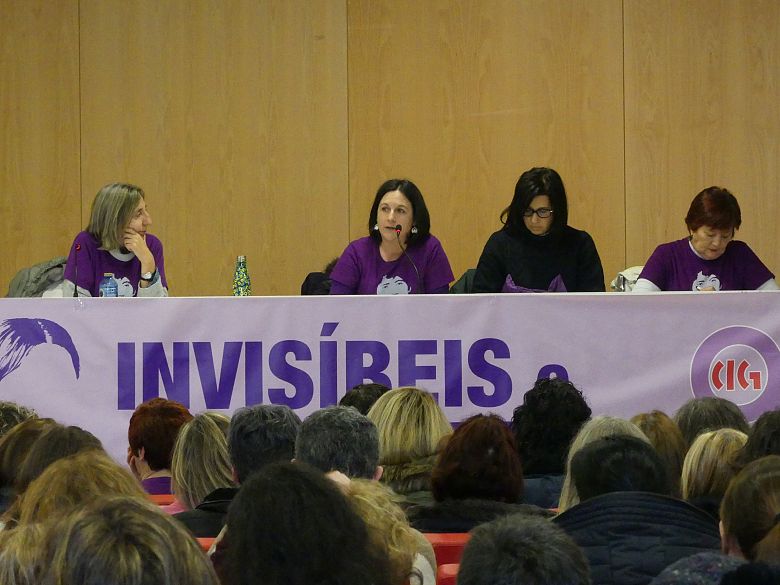 Para demostralo, a economista da CIG Natividade López, fixo un percorrido polos datos do informe que xa se presentou a pasada semana e que demostran que no mundo laboral os traballos feminizados seguen sendo sinónimo de oficios precarios, nos que se perciben os peores salarios e en peores condicións laborais, con xornadas parciais, dereitos laborais non recoñecidos, acoso, agresións e precariedade. Sen esquecernos da invisibilidade dos labores de coidados, e de todo ese tempo de traballo realizado de balde, principalmente polas mulleres, pero do que se beneficia o resto da sociedade.