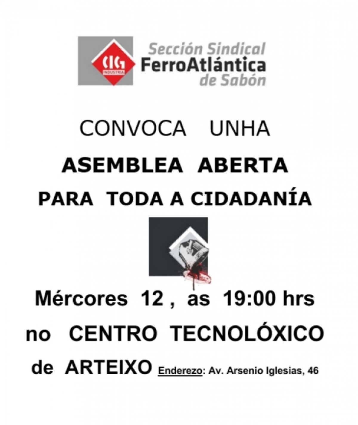 A sección sindical da CIG en Ferroatlántica Sabón ten convocada unha asemblea aberta para este mércores 13 de xuño, ás 19 horas, no Centro Tecnolóxico de Arteixo, para informar do "plan industrial" de melloras que a empresa pretende negociar co comité, pero condicionando calquera posíbel inversión a que o persoal acepte a escisión da fábrica de Sabón da unidade industrial.