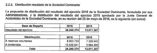 - A sociedade dominante do grupo (LUIS CALVO SANZ S.A.), atribúese 24.240.374 € de beneficios, destinando a dividendos (ou sexa, distribuíndo aos socios) 15.636.641 € e deixando só 8.603.733 € en reservas voluntarias (isto é, “reinvestindo” no grupo apenas un terzo dos beneficios, mentres que os dous terzos restantes marcharon para o peto dos accionistas). En 2015 xa viñan de repartir dividendos por valor de 5.684.505 € (p. 13, CCAA consolidadas 2016)
