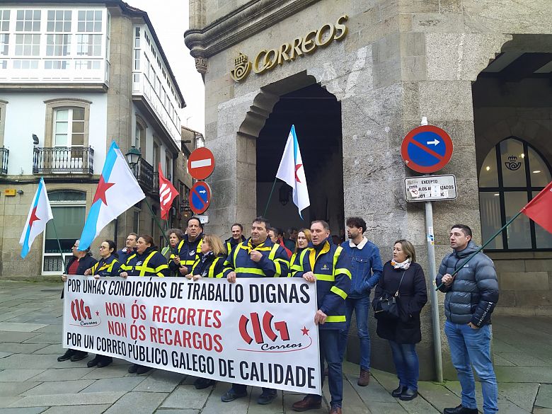 A CIG-Correos concentrouse esta tarde diante da oficina principal de Correos de Santiago de Compostela, na rúa do Franco, onde está a Xefatura Territorial, para denunciar a falta de persoal na unidade de reparto de Lalín pola falta de cobertura de vacantes e outro tipo de baixas e exixir que se garanta o servizo postal universal nesta localidade.