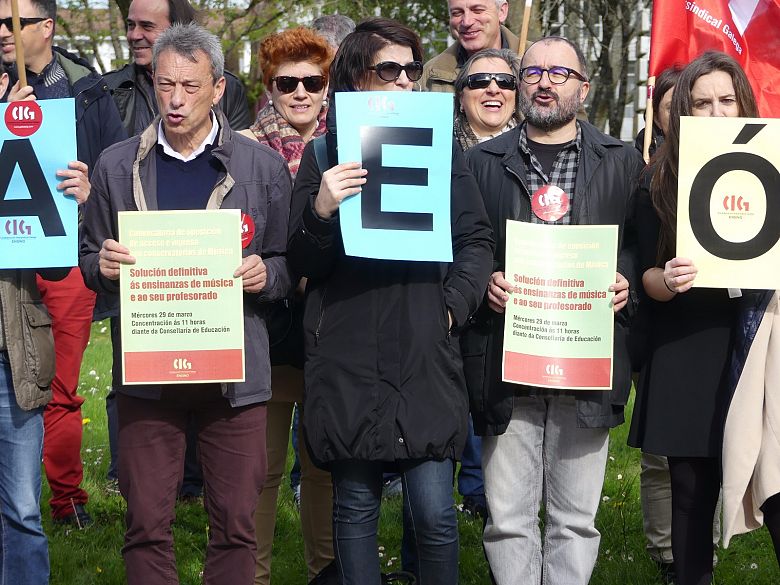 A CIG-Ensino concentrouse esta mañá diante de Educación para denunciar a falta de planificación da consellaría, o desinterese da Administración polas ensinanzas musicais e a perda de carga horaria das materias de música na ESO e en bacharelato, tanto coa LOE como coa LOMCE, que á súa vez provocou unha redución de postos de traballo e o uso da materia de Música como comodín para completar horario doutras materias.