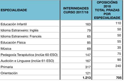 As cifras das prazas ofertadas, sumando todas as quendas (como se pode ver nas táboas anexas), dá en moitos casos un número idéntico ou moi próximo ao total de persoas que agora mesmo están con contrato de interinidade por curso completo. Isto implica que non se tivo en conta a posíbel incidencia das oposicións no persoal interino.