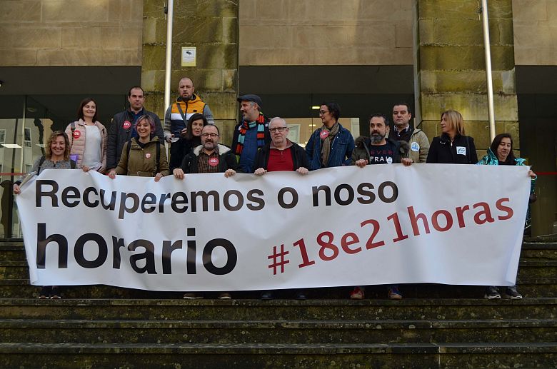 Así se dirixía o secretario nacional da CIG-Ensino, Suso Bermello, aos representantes da Consellaría de Educación na Mesa Sectorial que, unha vez máis, se negaban a abrir calquera negociación ao respecto. As organizacións con representación na Mesa Sectorial (CIG-Ensino, CCOO-Ensino, ANPE e UGT) despregaron unha pancarta co lema da recuperación horaria dentro da sala na que se celebrou a reunión despois de concentrarse no exterior acompañados de representantes das outras dúas organizacións que non están neste órgano (CSIF e STEG).